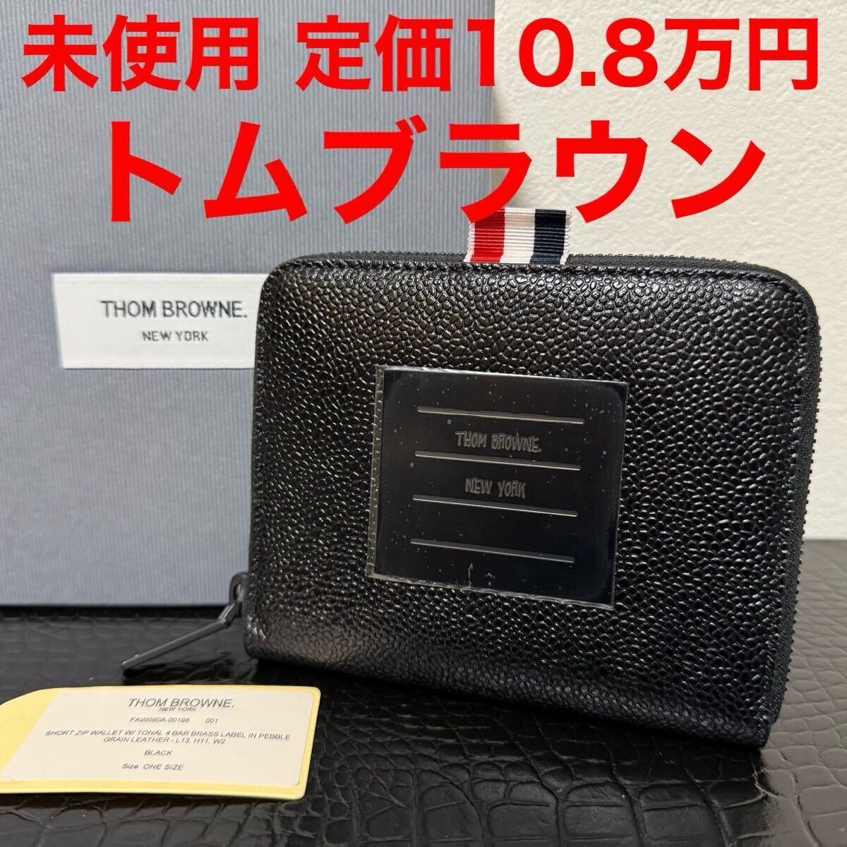 - トムブラウン THOM BROWNE 折財布 ウォレッ ラウンドジップ ブラック 黒色 レザー ペブルレザー ロゴプレート