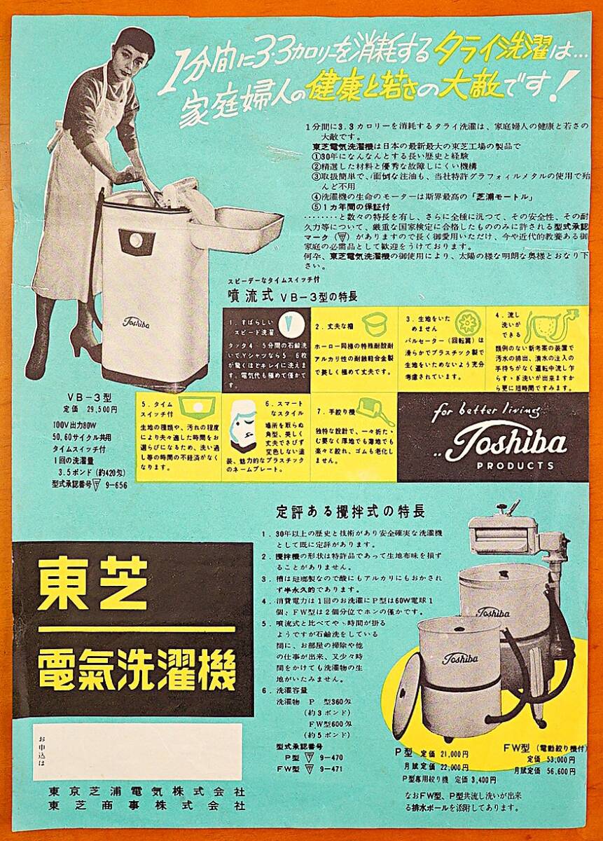 - 東芝電気洗濯機 チラシ1枚 噴流式VB-3型 攪拌式P型FW型 東京芝浦電気(株) 1955年頃 検:芝浦モートル 一槽式洗濯機ランドリー白物家電歴史