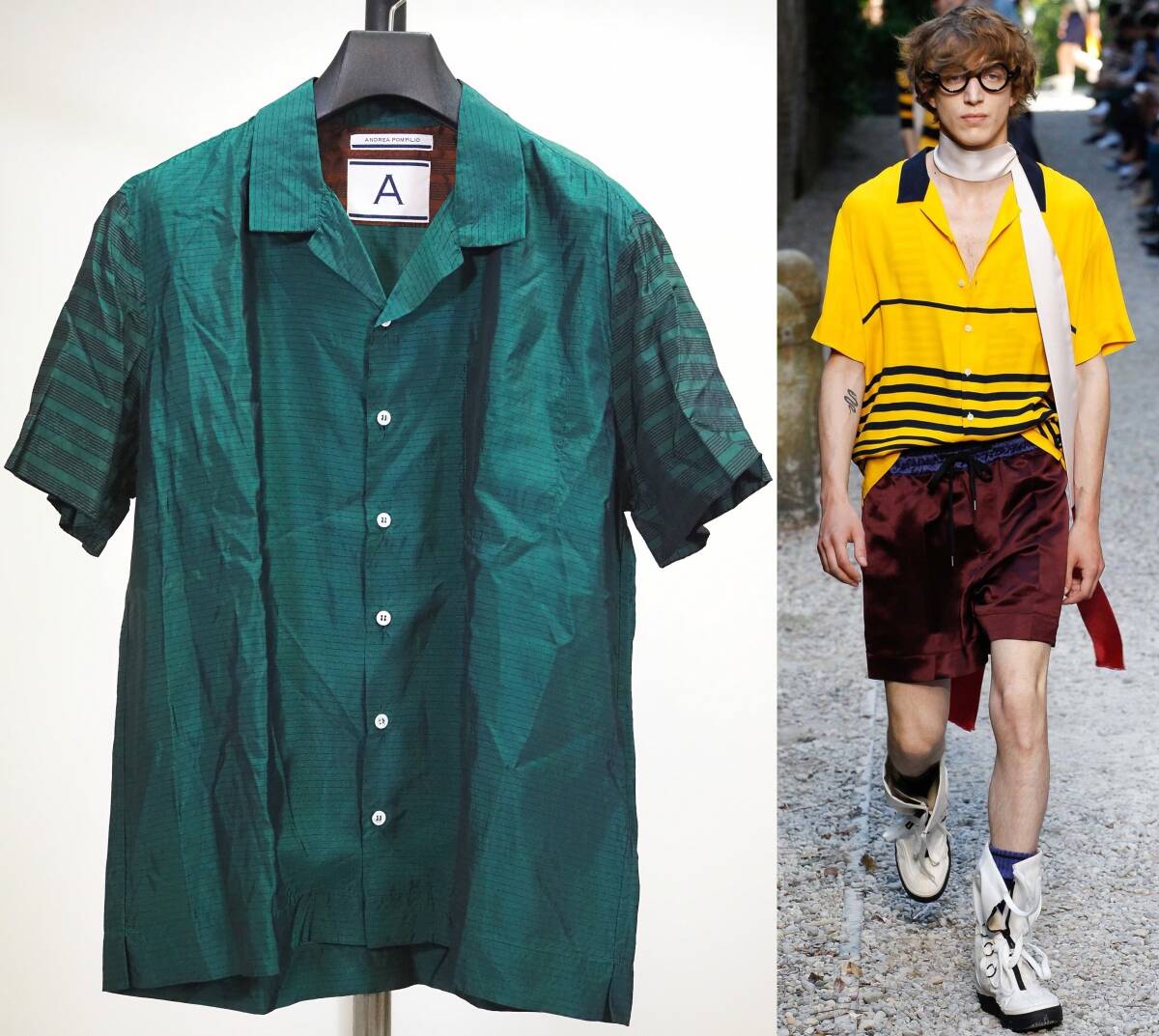 - 美品 ANDREA POMPILIO アンドレアポンピリオ 16SSオープンカラー半袖サテンシャツ44緑 Italy製
