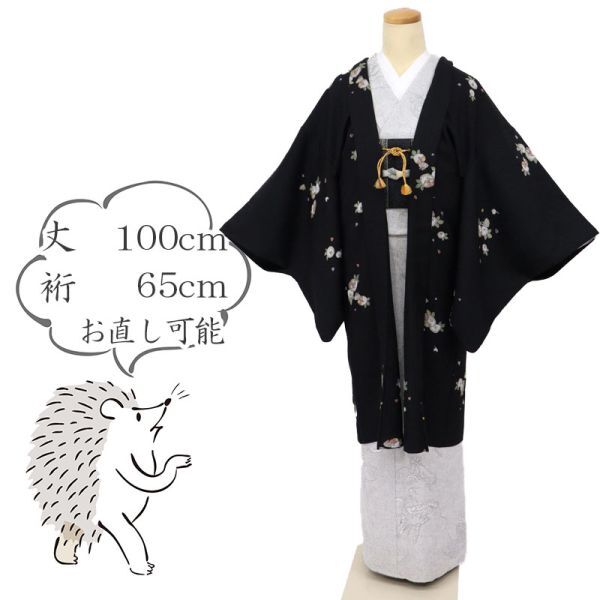 - 【羽織】 光琳椿に雪うさぎ ひも付き 黒地 和装コート 正絹着物上 CB1-17