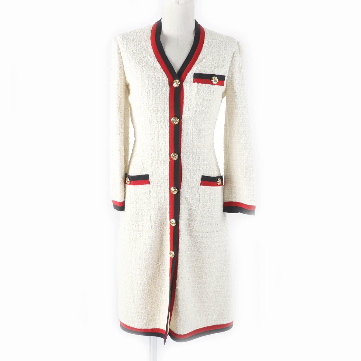> 極美品★GUCCI グッチ 19SS 551562 GGボタン付 ウェブライン Vネック ツイード ロング ワンピース オフホワイト 36 正規品 レディース