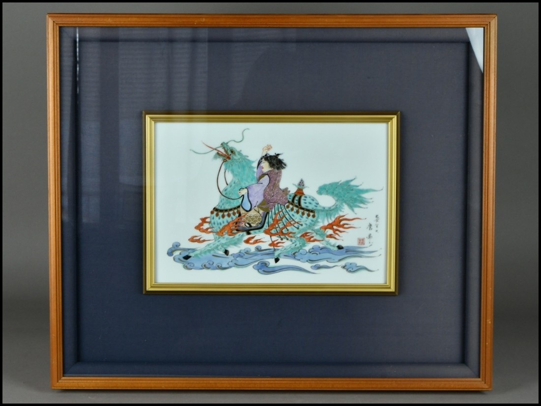 > 肥前有田 絵付師【鷹巣照久(鷹峯)】錦 麒麟図 花鳥図 陶板 壁飾 額装 幅59cm D253-46