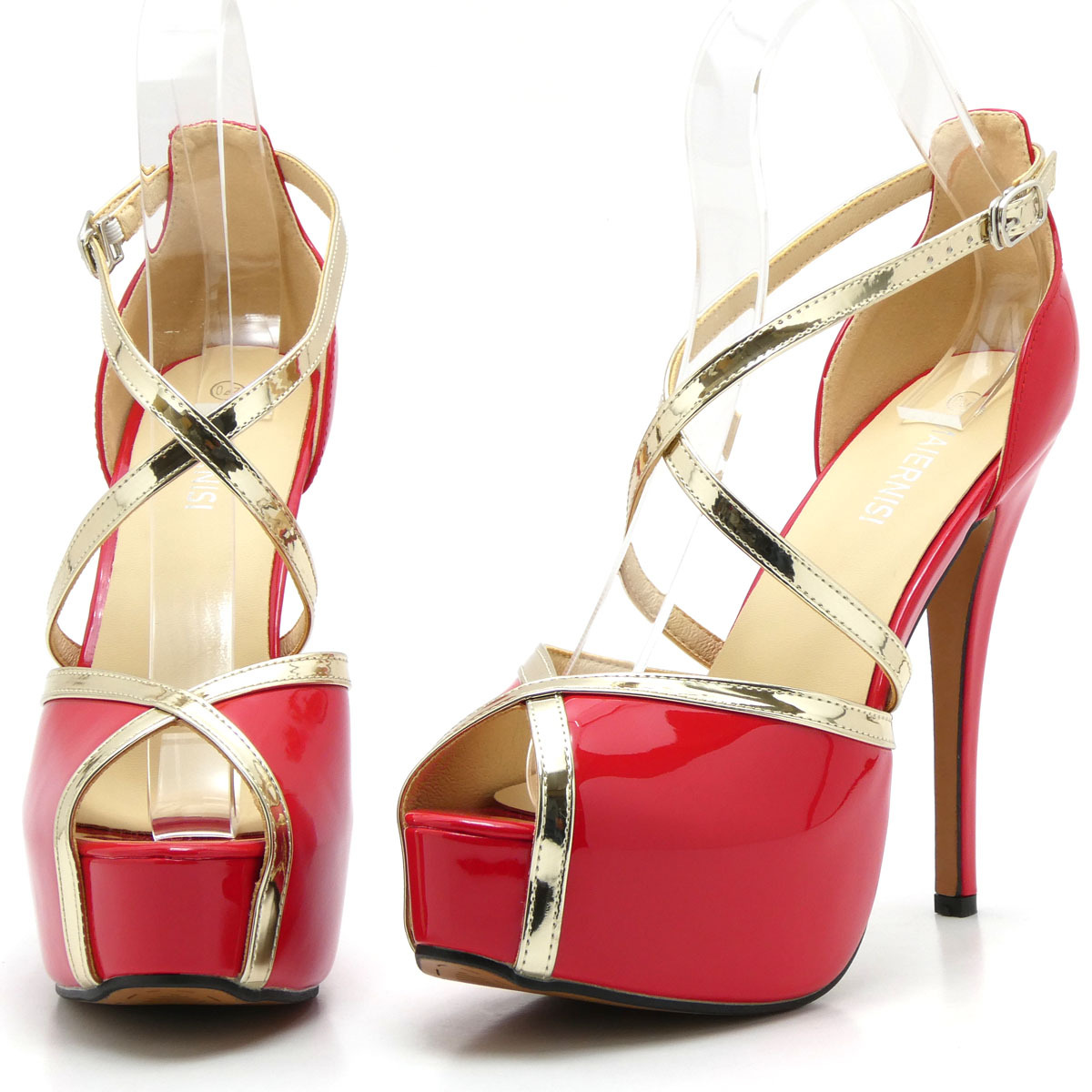 - 新品 大きいサイズ パンプス レッド 28cm 131502-46 エナメル調 オープントゥ クロスストラップ 前厚底ストーム ハイヒール