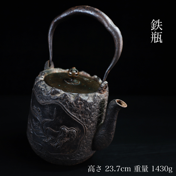 > ◇雅◇ 時代 釜師造 陽刻漢詩蓮葉紋 鉄瓶 岩肌 高さ23.7cm/1430g 摘み 急須 鉄器 鐡瓶 茶道具 煎茶道具 古美術品 /OB.25.3 [H54.1] OWX2