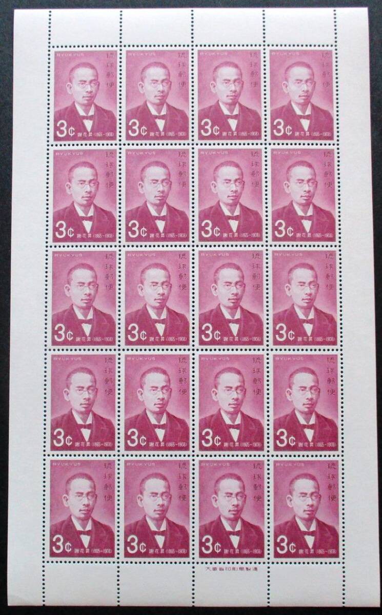 > 沖縄切手・琉球切手 偉人シリーズ 謝花昇 3¢切手 20面シート 204 ほぼ美品です。画像参照して下さい。