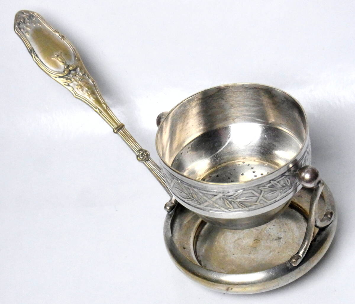 - フランスアンティーク ティーストレーナー シルバープレート 銀鍍金 ホルダーハンドル付き ルイ15世様式 月桂樹 骨董 クロネコ宅急便60