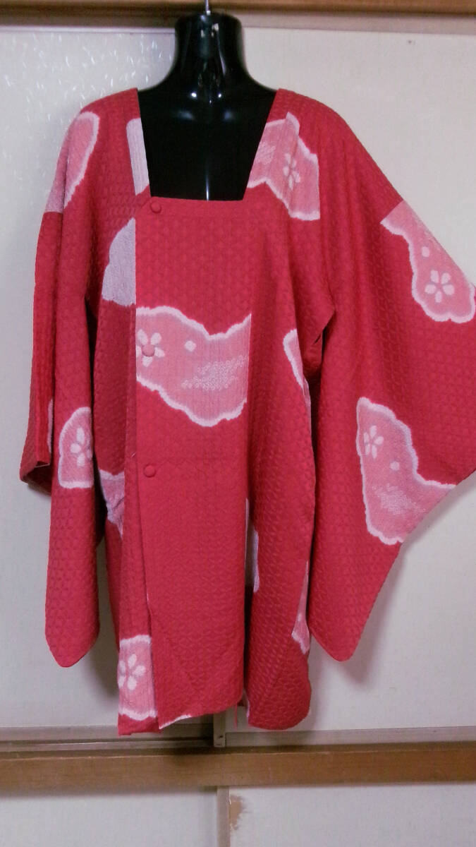 - 159【アンティーク品】紅色雲模様※正絹※膨れ織※袷※道行コート 丈89 裄66,5