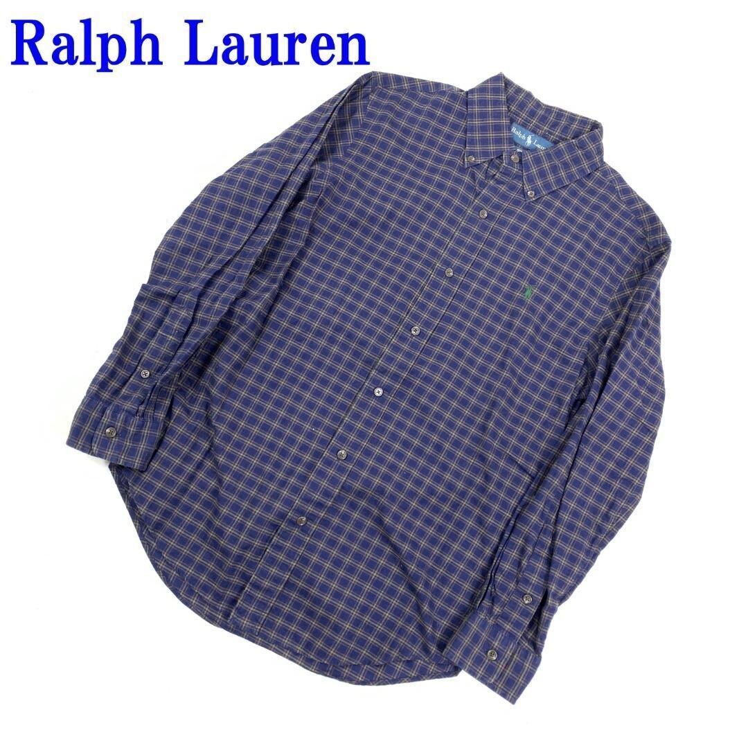 - ラルフローレン 長袖シャツ 綿 チェック ワンポイント刺繍 紺 Ralph Lauren コットン ボタンダウン ネイビー CUSTUM FIT 165/96A M C2337