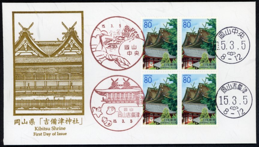 - 1360 【FDC】ふるさと 岡山県「吉備津神社」[岡山中央、岡山吉備津/15.3.5/鳴美版](解説書なし)