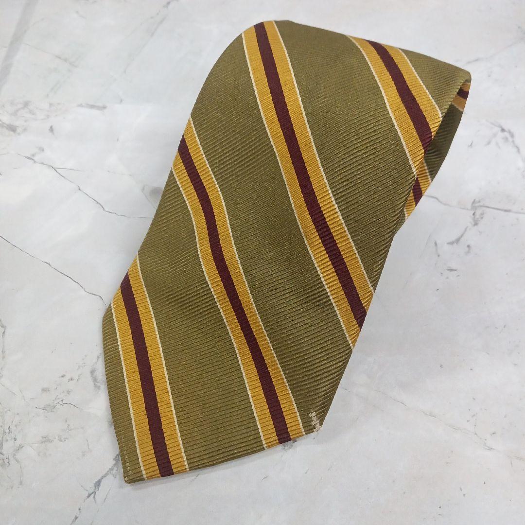 - ファッソナブル ネクタイ 深緑+黄色・茶ストライプ柄 シルク 絹【n1137】