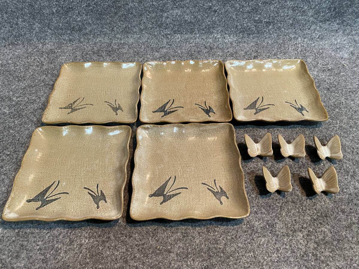 - 【和食器】瀬戸焼 雅窯 角皿 銘々皿 取皿 箸置 蝶絵 5組