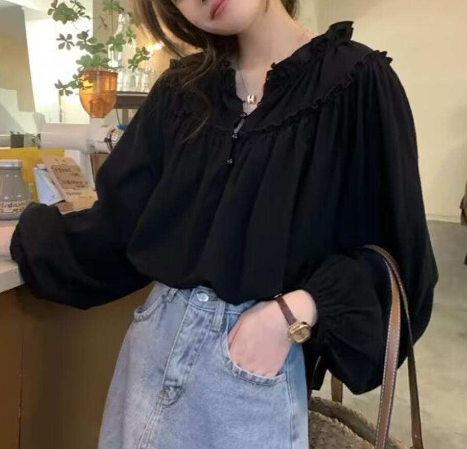 - 春夏新入荷 *シンプル ゆったり ブラウス 長袖 レディース tシャツ シフォン シャツ トップス カジュアル おしゃれ 通勤 ブラウス*黒