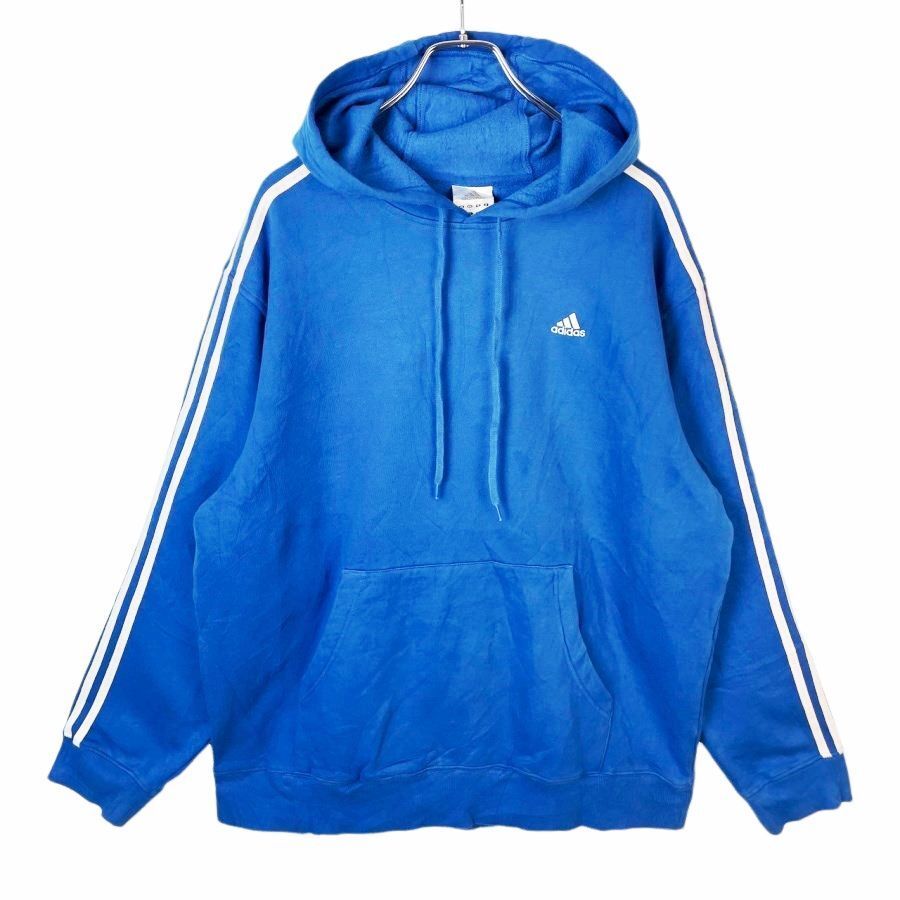 - アディダスAdidas袖ラインプルオーバーパーカーフーディスリーストライプ3本線ロゴ刺繍ワンポイント青ブルー白ホワイトvintage41227