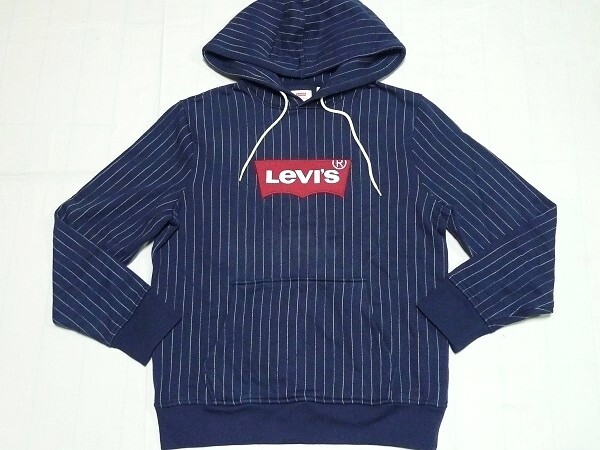 - 新品Levisリーバイス[ContrastPullOverHoodie]ロゴスウェットパーカーM(S)紺x白ストライプ\8800