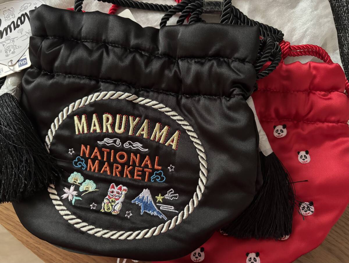 - GUケイタマルヤマ日本ドローストリングバッグ巾着バッグ黒ポシェット赤パンダ ネオン オリエンタル デザイン