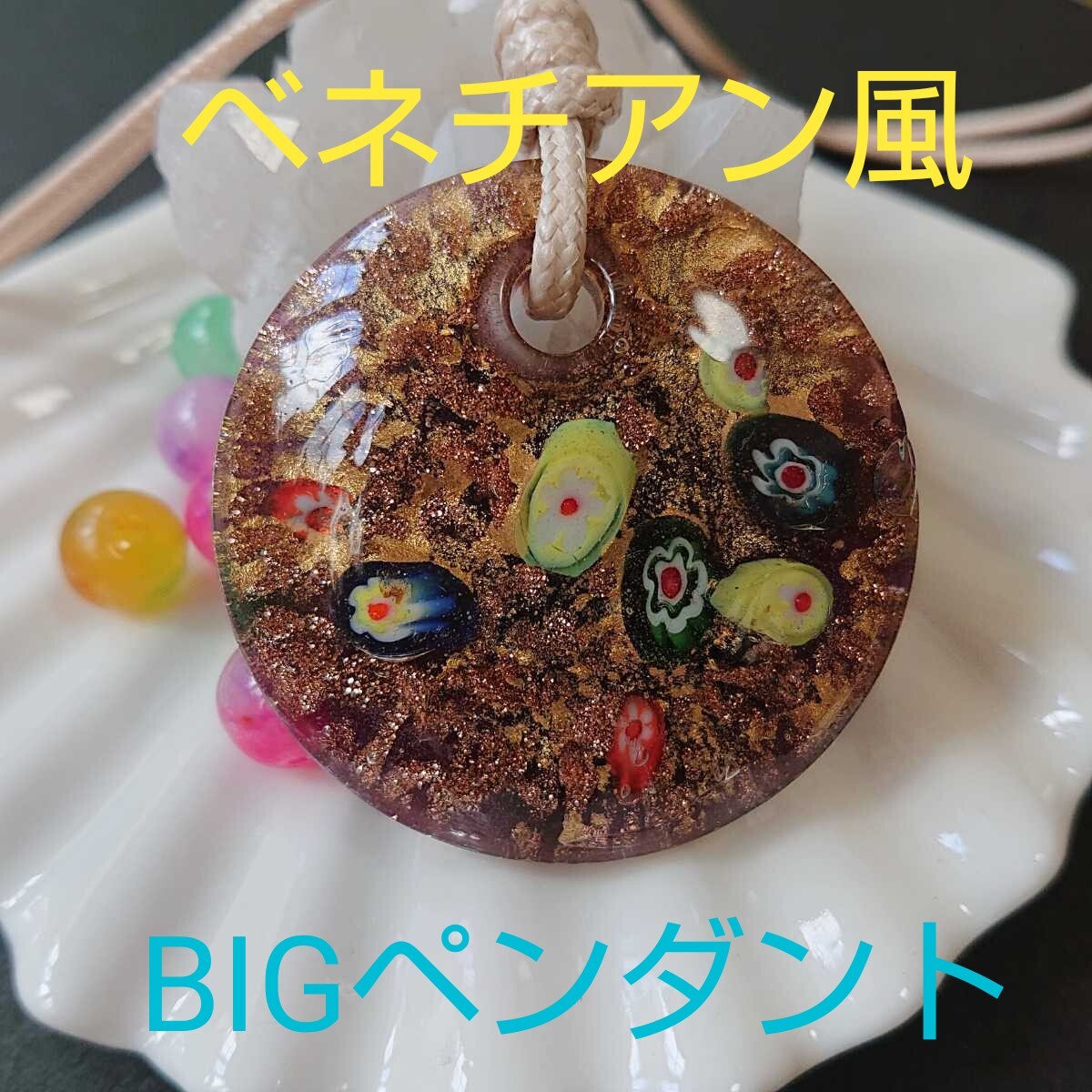 > ベネチアン風★BIG★箔ガラスA-2★ペンダント★パープルブラウン★1連《ワックスコード・ライトベージュ》《同梱・まとめて取引可能》