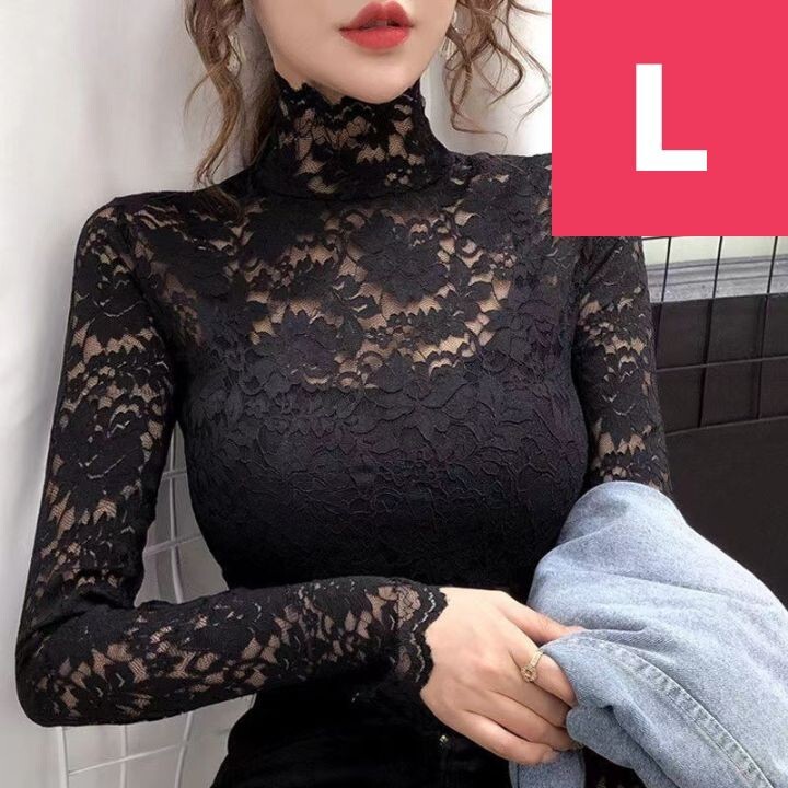 - 花柄レース 高見え ハイネック L シースルー インナー おしゃれ ブラック