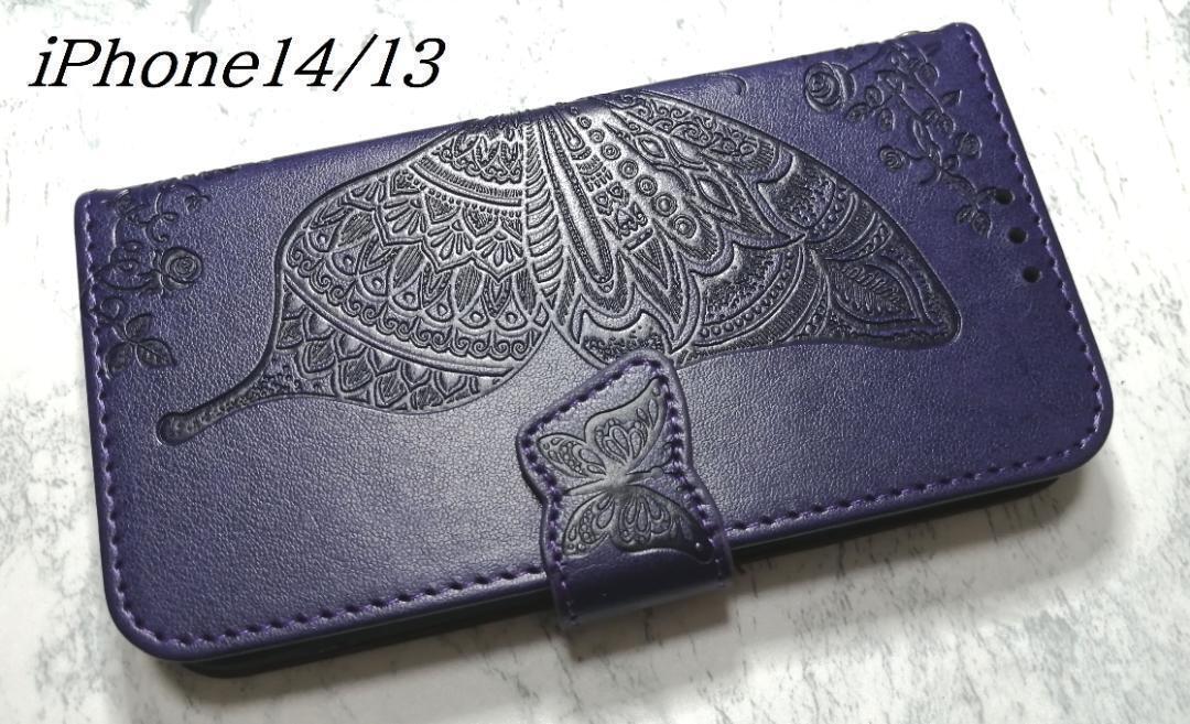 > iPhone14/13 用 スマホケース 手帳型 蝶 花柄 パープル 紫色