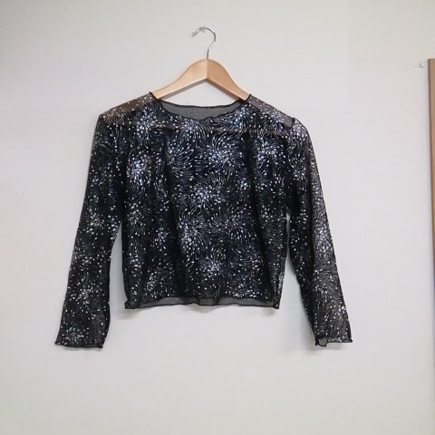 > ★【古着】 メーカー不明 シースルートップス(長袖レース) 社交ダンス衣装 サイズ不明 ブラック 渦巻き模様 透け感あり