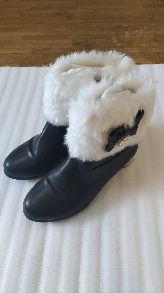 - No.2675_海外ロリィタ_黒ファーとリボン飾りショートブーツ
