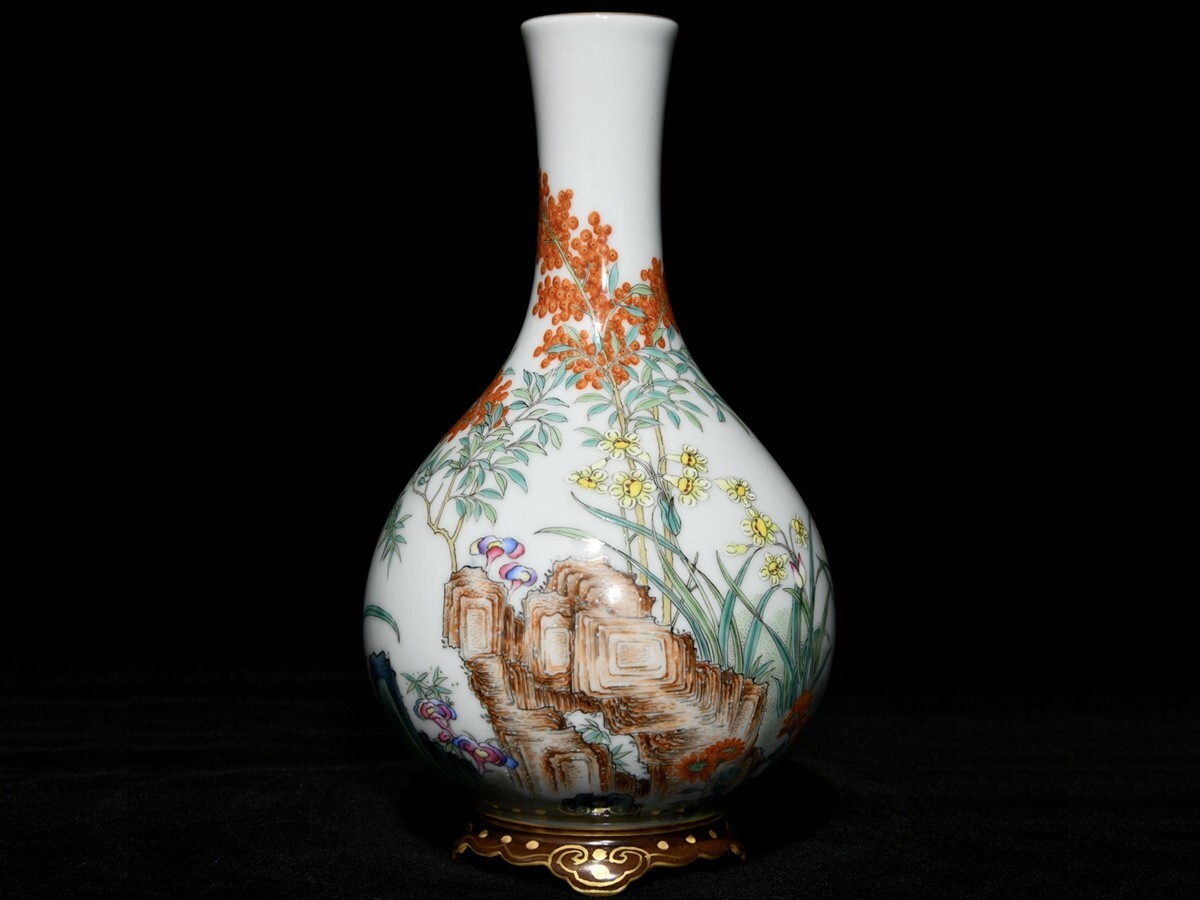 - 「清 乾隆年製 陶磁器 粉彩梅蘭竹菊紋連座膽瓶」染付 置物 擺件 古賞物 中国古美術 旧蔵出