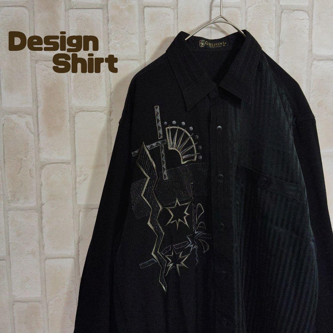 - デザイン シャツ 長袖 黒 刺繍 漆黒 幾何学模様