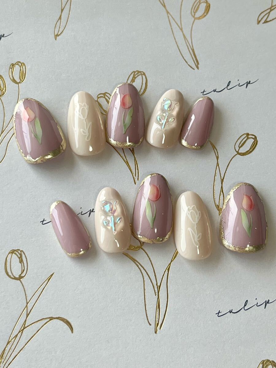 - ハンドメイド ネイルチップ ショートアーモンド ベージュ アイボリー パープル ライラック チューリップ