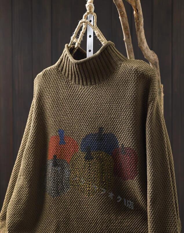 - プリントカバチャ柄 ハーフネック-3 ニット セーター 綿100% ゆったり トップス チュニック 大人可愛 フリーサイズ ナチュラル
