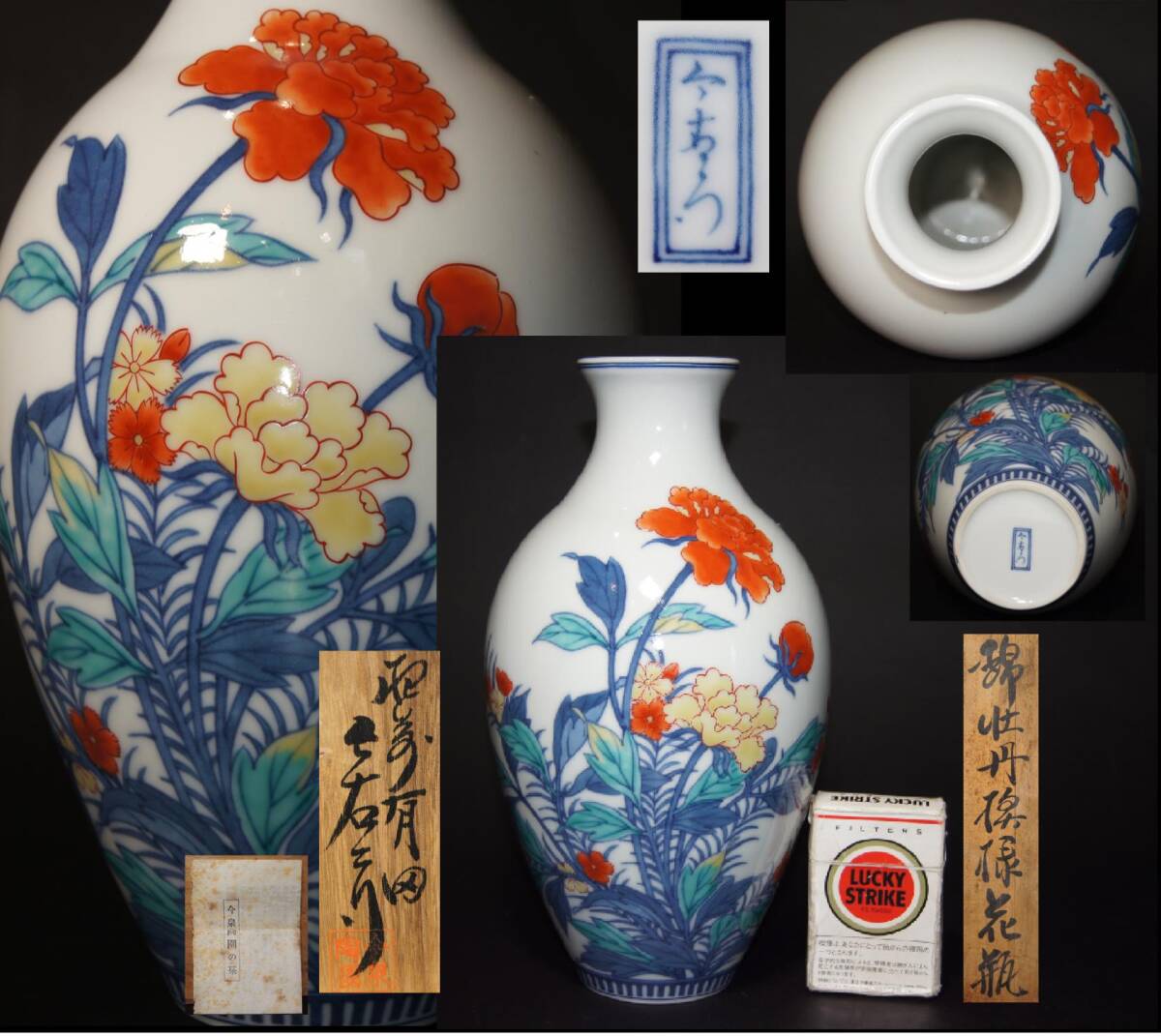 > ■人間国宝 十二代 今泉今右衛門 造■ 錦牡丹模様花瓶 色鍋島 短冊銘 共箱・栞付 牡丹絵 花器 花生 花入 飾壷 色絵 真贋保証