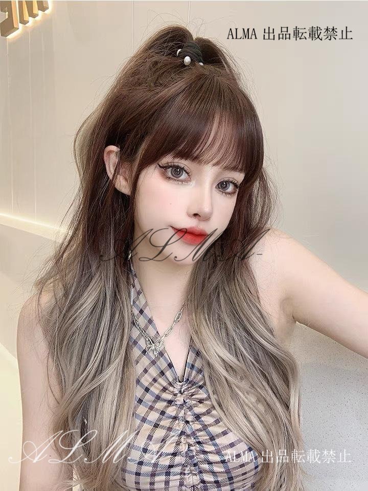 - 新品人毛 ブラックゴールドグラデーションウィッグ ロングウェーブ つむじ部分手植え 自然に見えますフルウィッグ