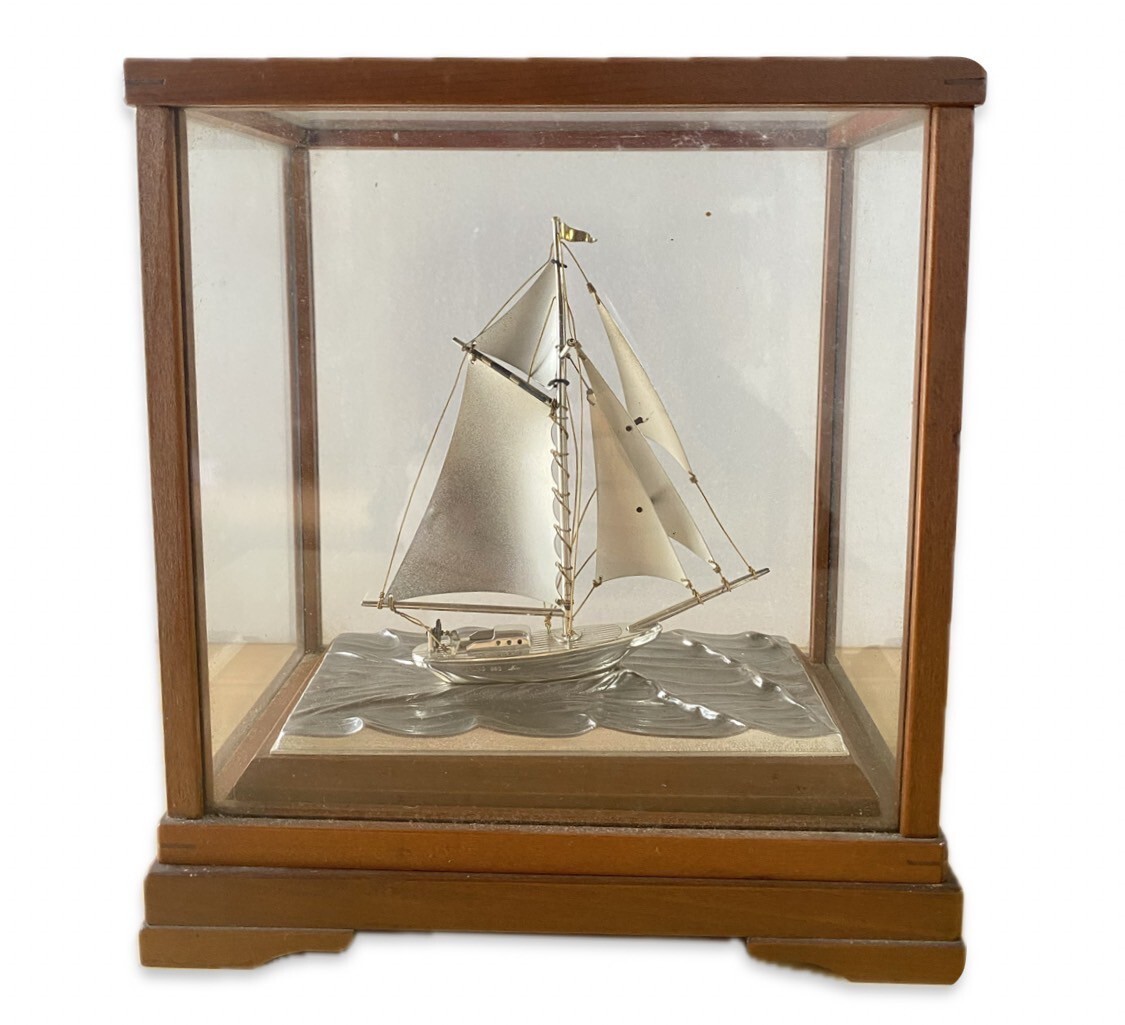 - STERLING 960 刻印 銀製ヨット 置物 土台部分 SILVER PLATED SEKI 関工芸 銀細工 ガラスケース付