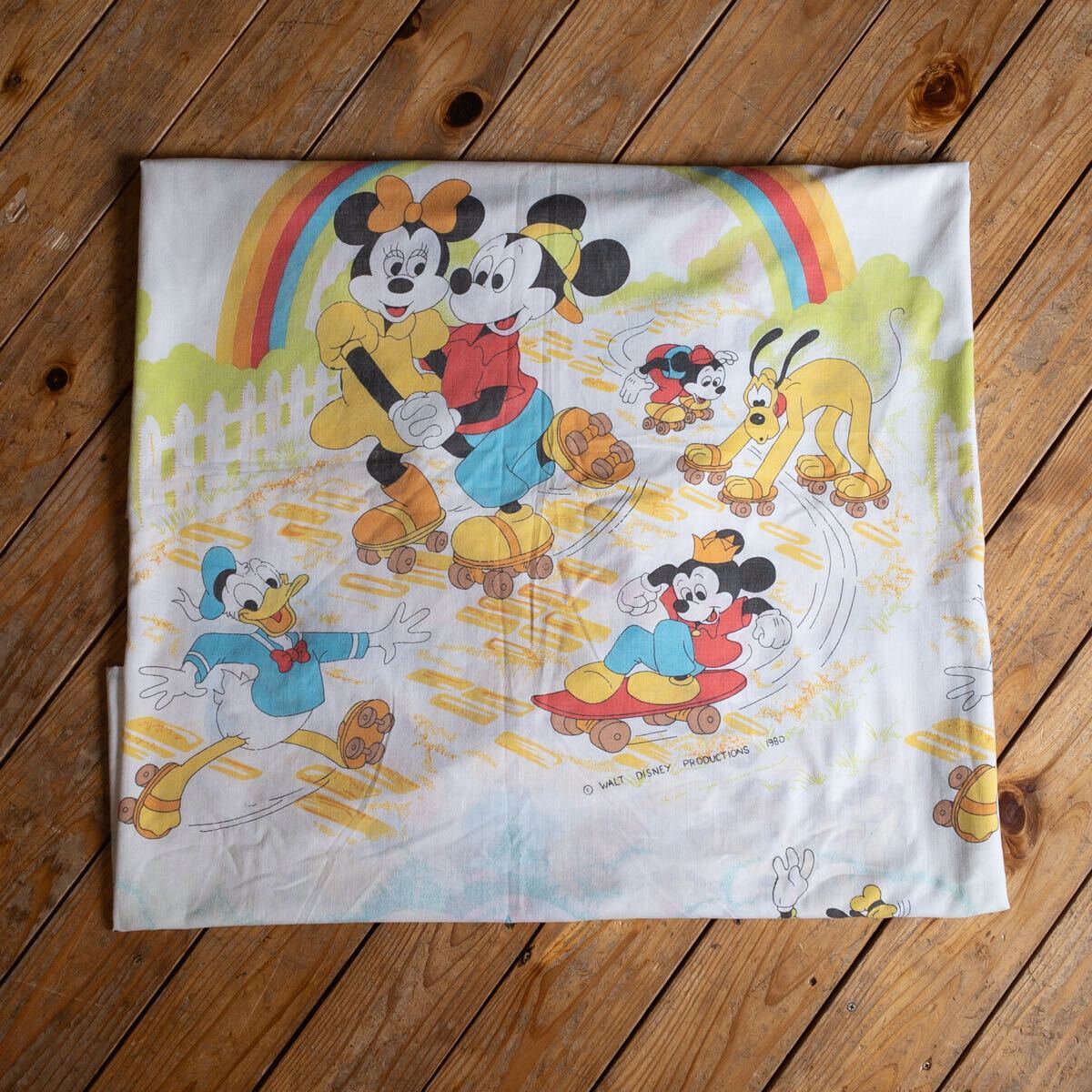 > USAヴィンテージ ベッドシーツ Disney ディズニー リメイク生地 ミッキーマウス 虹 レインボー 素材 フラットシーツ アメリカ仕入 B2962