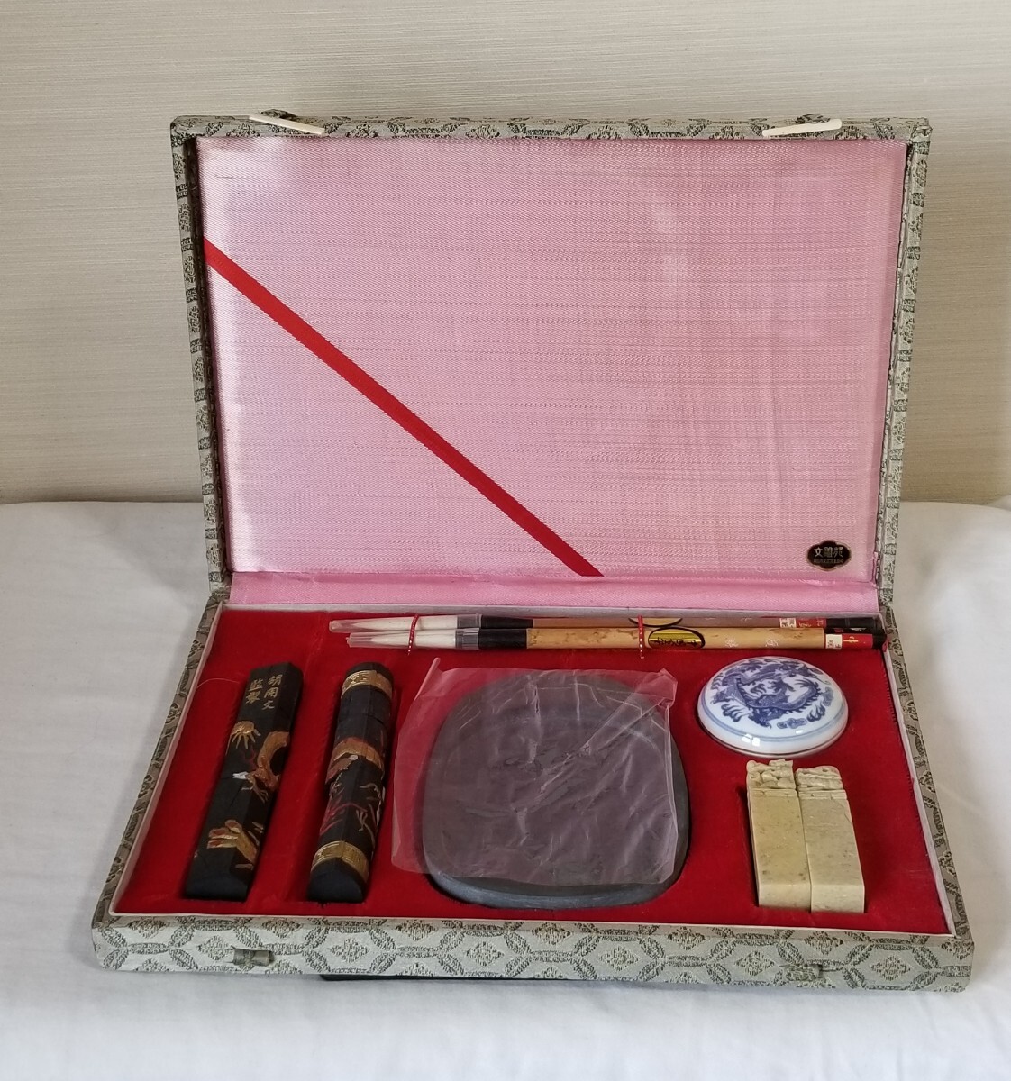 - T-400 アンティーク 書道具セット 中国文房四宝 安微黄山 文雕苑 中国宣筆 墨(法龍 龍翔/鳳舞) 筆 硯 印泥 書道具 ケース入 保管品