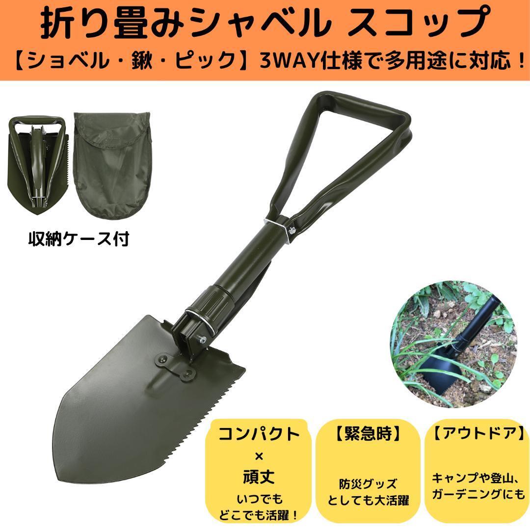- ポータブルショベル スコップ 緑 収納ケース付 tアウトドア キャンプ 登山 防災 組み立て 折りたたみ シャベル クワ つるはし ギザギザ