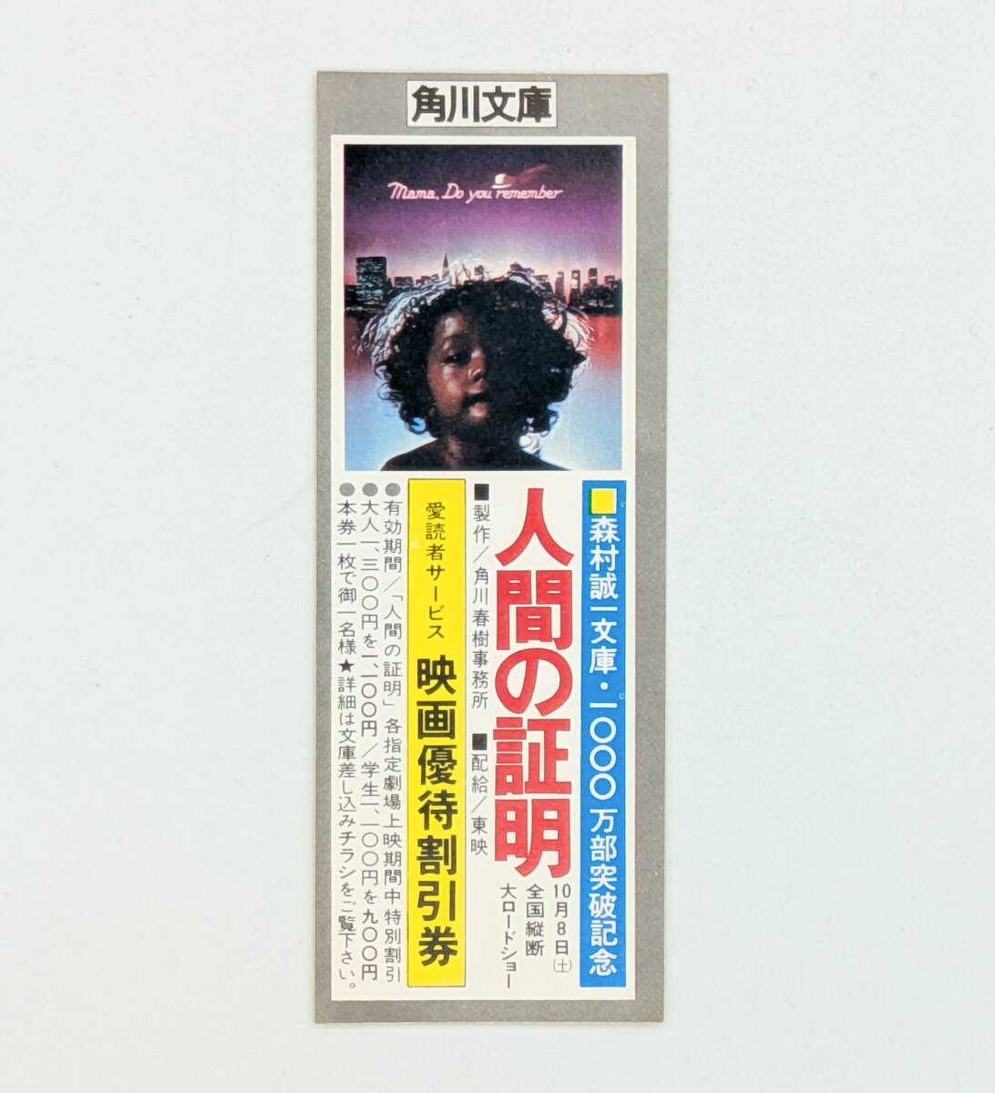 - 【美品】角川文庫 人間の証明 映画優待割引券 ●しおり●当時物●森村誠一