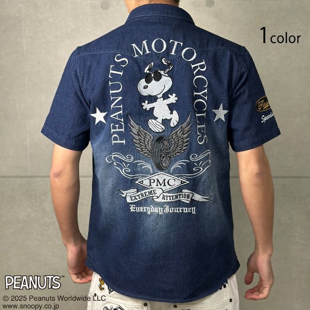 > スヌーピー×フラッグスタッフ モーターサイクルデニム半袖シャツ◆Flagstaff インディゴ XXLサイズ 452096 刺繍 ウッドストック バイカー