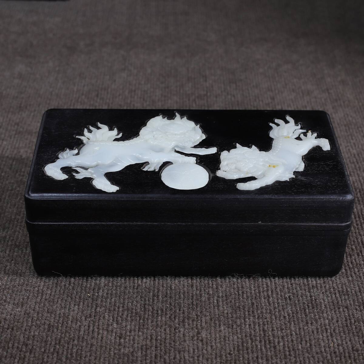 - 旧蔵 清 黑檀木 はめ込む玉 開蓋多寶盒 收納盒 木製 文房具 極細工 中国古玩 古美術 骨董品 204-30
