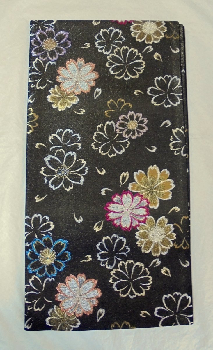 - 5224 正絹 振袖用 袋帯「黒地・桜/金銀」-