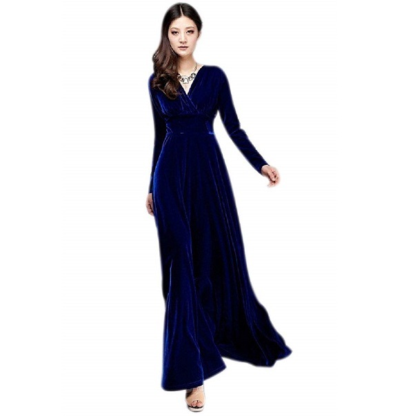 - Vネック ベロア ハイウエスト ロング ドレス (青 XL)マキシ丈 カシュクール ワンピース パーティー