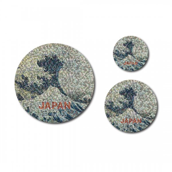 - 日本製 浮世絵 ステッカー 3点セット 丸型 新品 波 富士山 ホログラム グロス 日本の美しさ お土産 プレゼント おしゃれ キラキラ 派手和柄