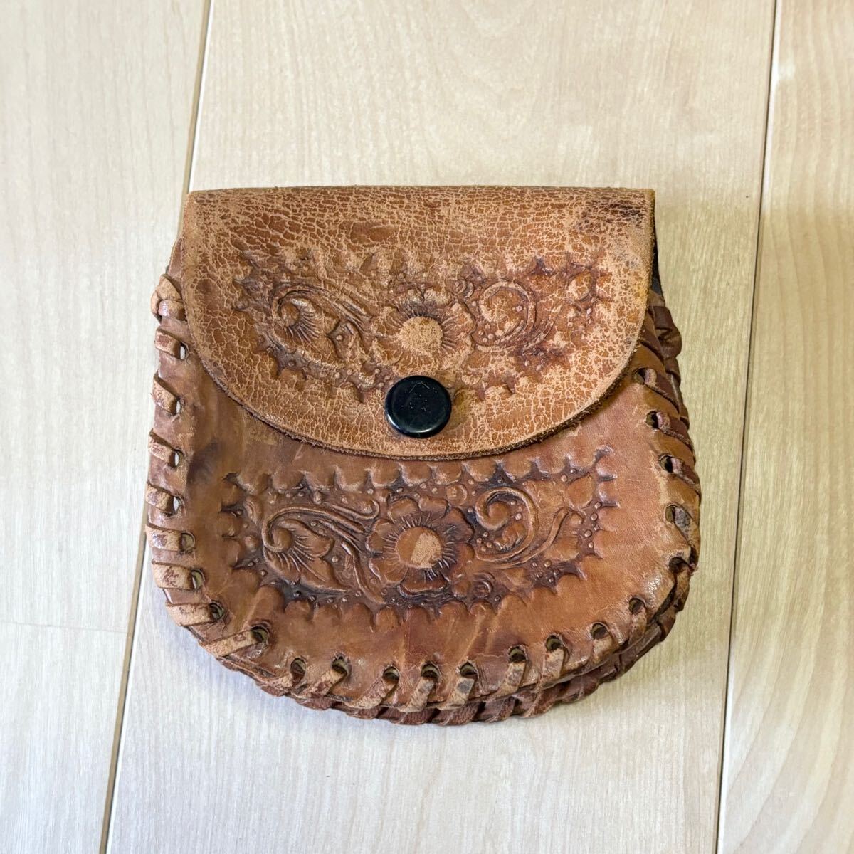 - 本革 コンパクトポーチ リアルレザー ブラウン フラワー 花柄 カービング