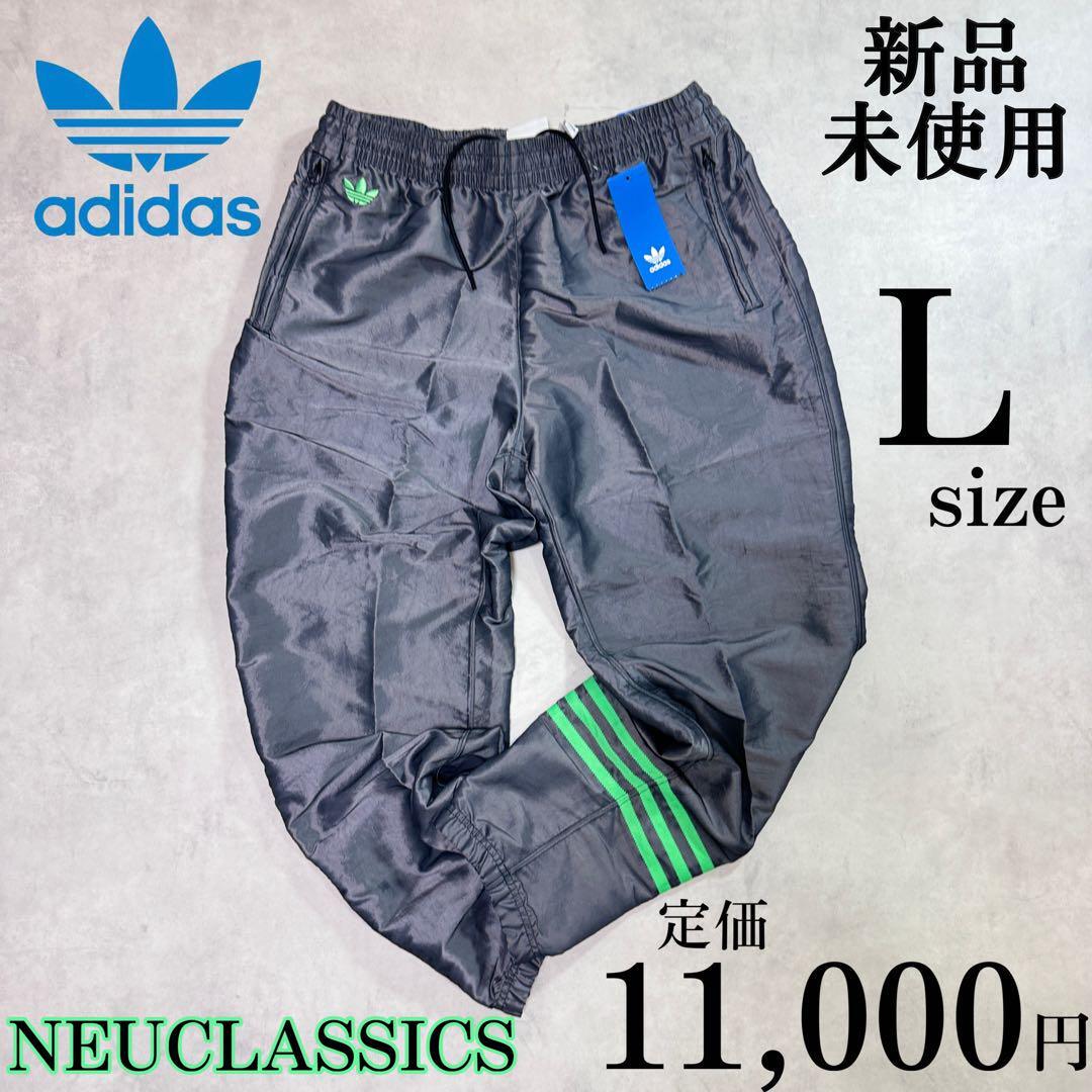 > 新品 Lサイズ アディダスオリジナルス ナイロン ウーブン パンツ グレー 緑 adidas originals 3ストライプス ライン 刺繍 リブ 腰ゴム
