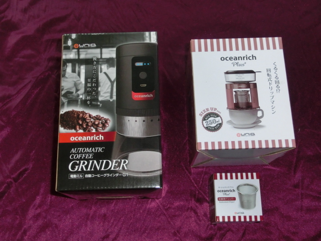 > 未使用UniQ 電動ミルと1回使用オーシャンリッチプラスのセット 未使用の交換用ドリッパーおまけ コーヒーメーカー・コーヒーミル