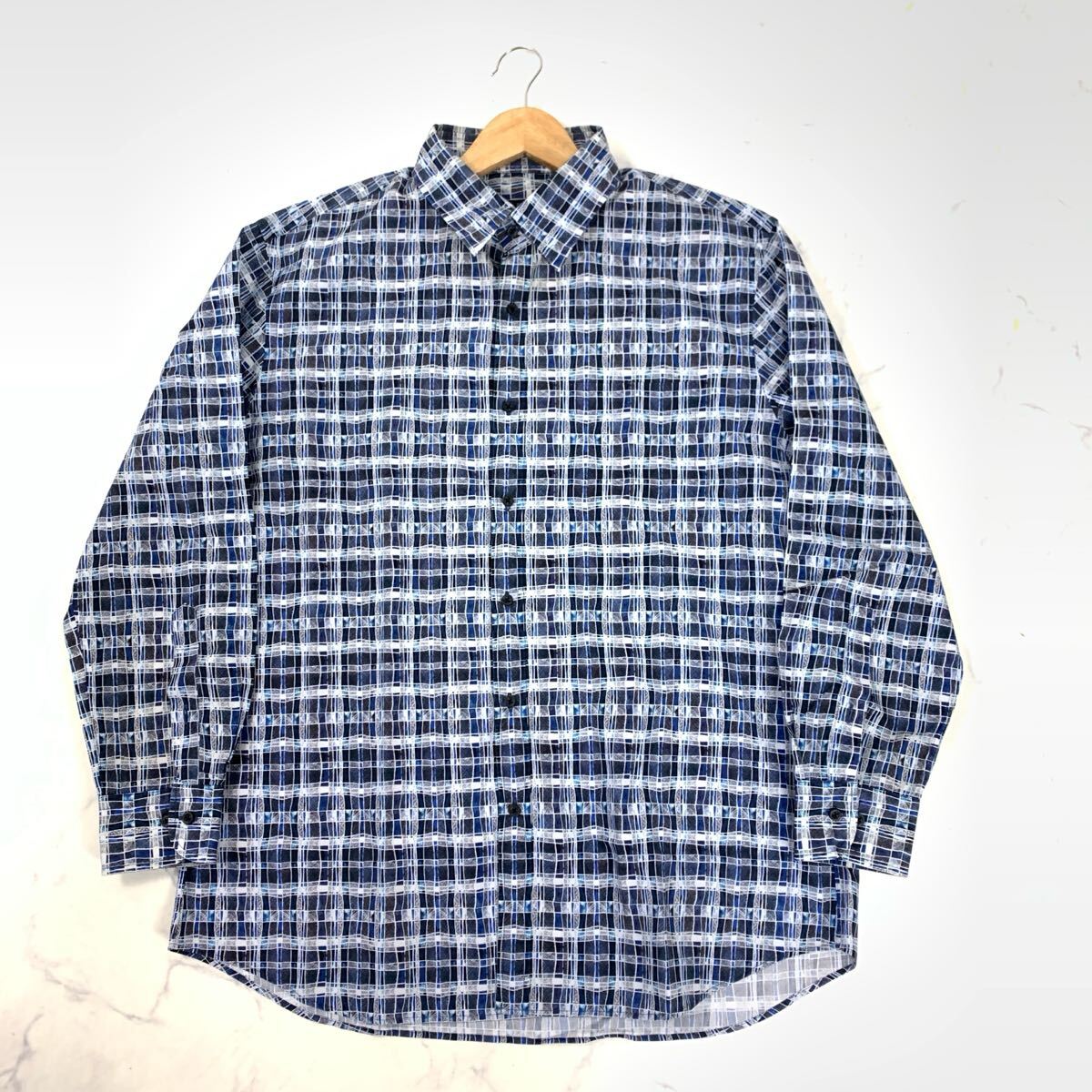 - ランバンコレクション 総柄 チェック 長袖シャツ ブルー LB YA9259