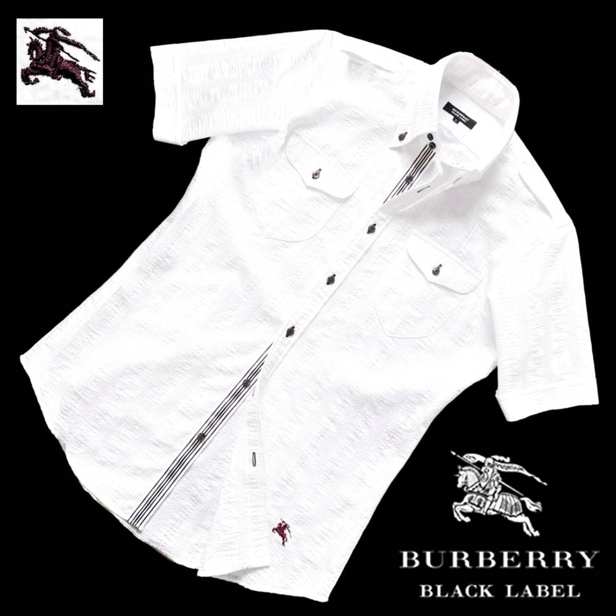 - 極美品 COOLMAX 爽快 バーバリーブラックレーベル BIGホース刺繍 前立てノバストライプ Wポケット 半袖シャツ 3/L 白 BURBERRY BLACK LABEL