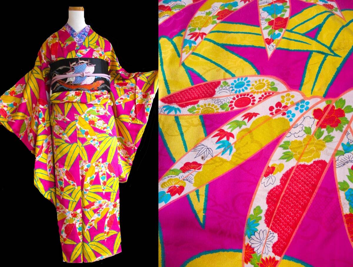 - 鮮やかピンク カラフル 竹笹 紋綸子アンティーク着物