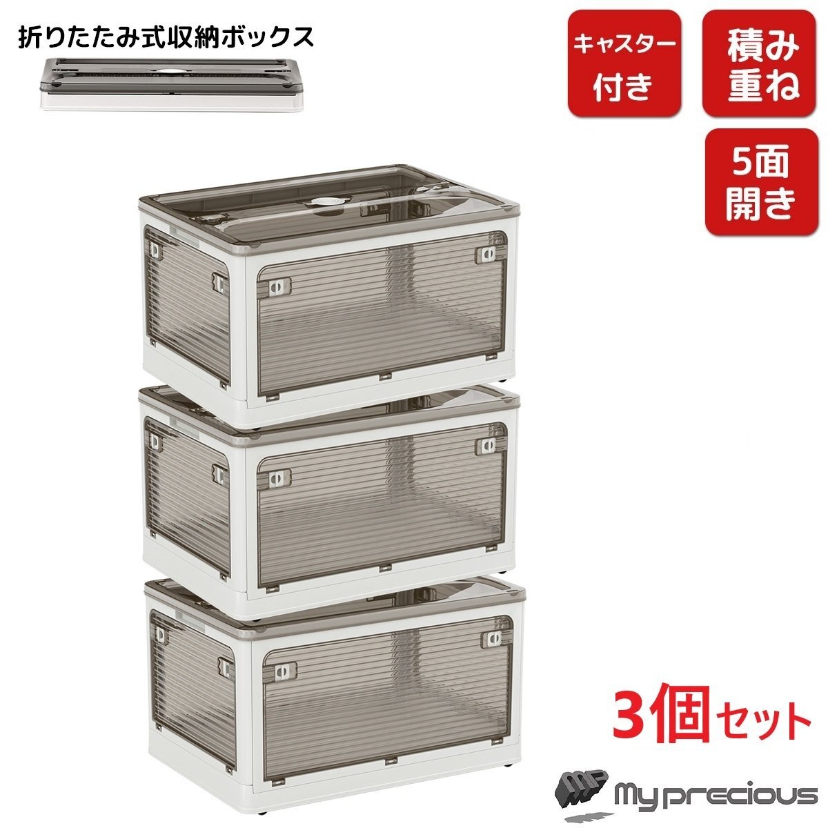 - 【3個セット】折りたたみ式 収納ケース 収納ボックス 128L 大容量 蓋付き キャスター付き 透明 衣類収納5面開き /5L ホワイト★送料無料