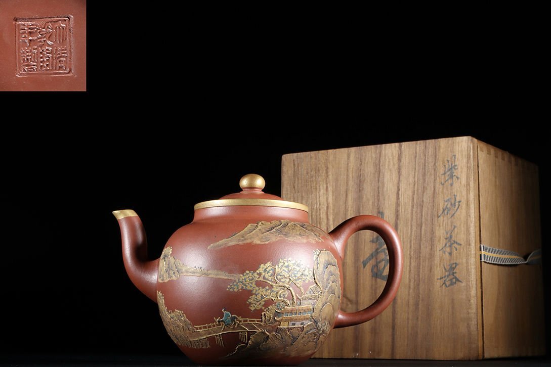 - ■観心・時代旧蔵■C7630時代朱泥 泥絵描金詩文山水珠圓紫砂壺 在銘 大清乾隆年製 /紫砂 煎茶道具 朱泥 茶壺