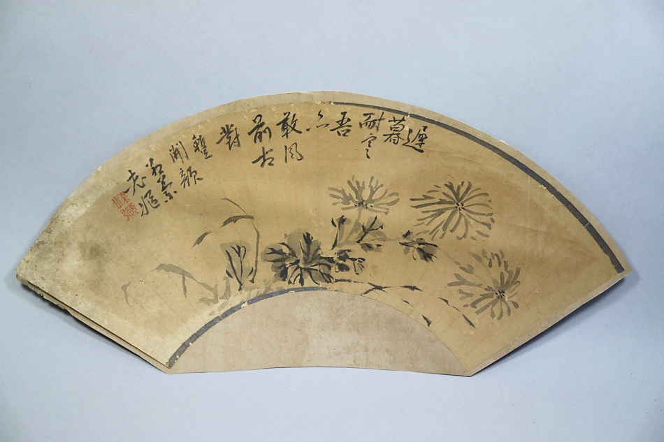 - sg28) 扇面画 菊花図 江戸末~明治時代 ●作者不詳 墨書<文人画 南画 墨絵 水墨画