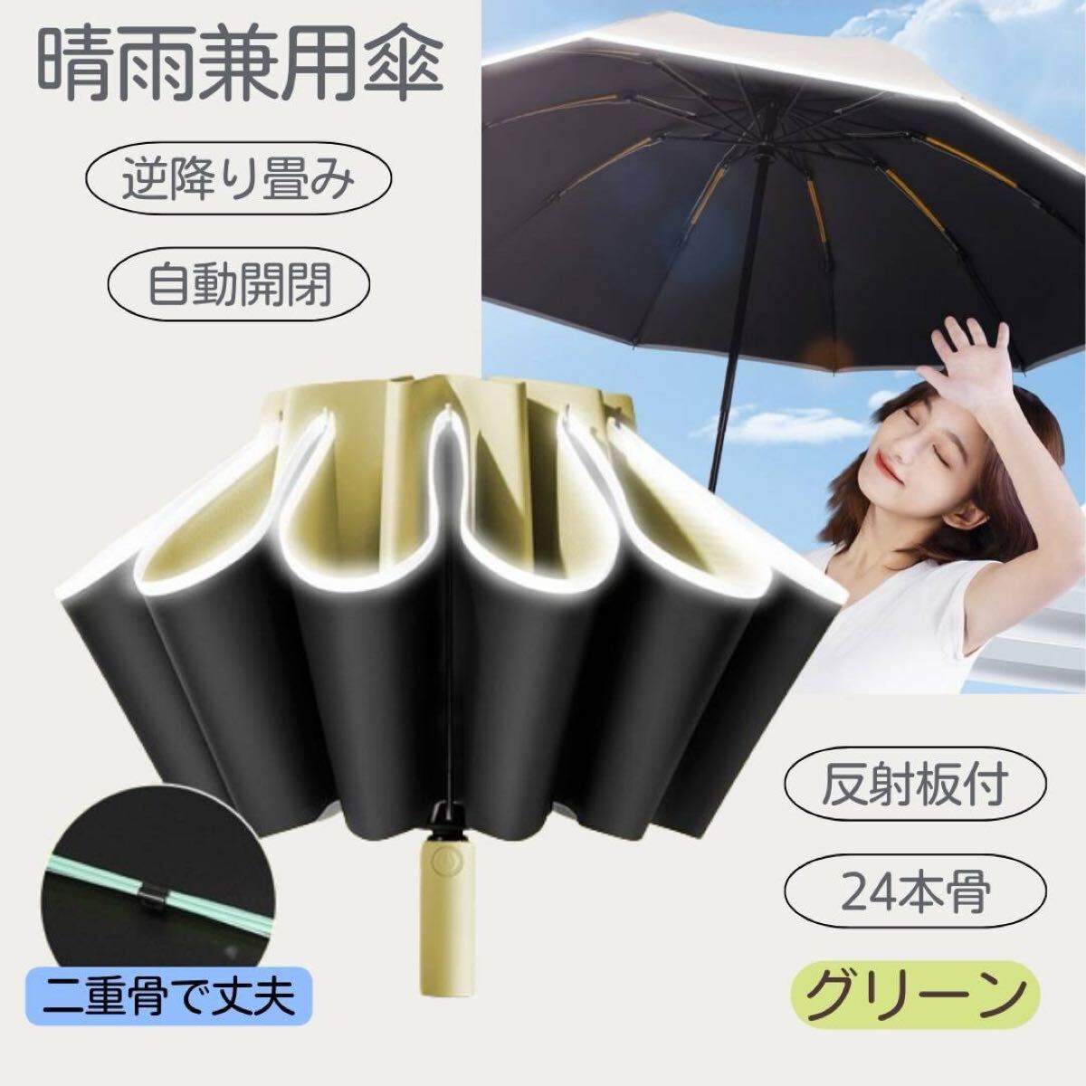 - 日傘 逆さ傘 折りたたみ グリーン 24本骨 ワンタッチ 自動開閉 晴雨兼用 UV